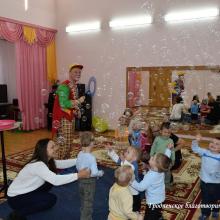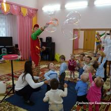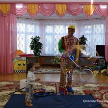 Для детей мы подготовили много сюрпризов, но, обо всем по порядку... Шурик Смех весело и задорно поиграл с детьми в яблоки и груши, познакомил детей со змейкой, и устроил для ребят настоящее шоу из мыльных пузырей.