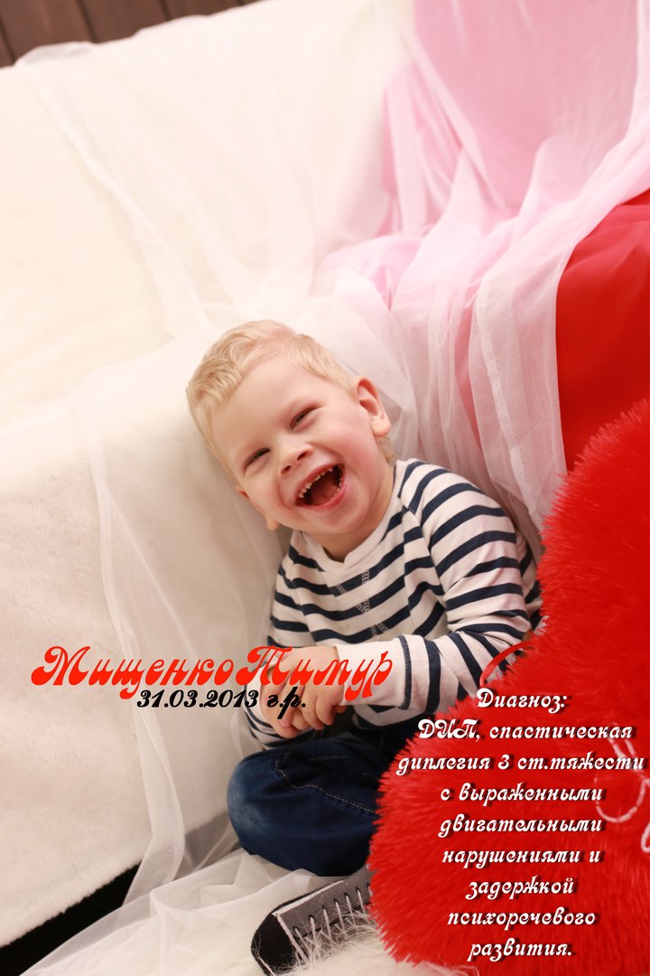 Тимуру чуть более трех лет (дата рождения Тимура 31.03.2013 г.). Диагноз Тимура: ДЦП, спастическая диплегия 3 степени тяжести с выраженными двигательными нарушениями и задержкой психоречевого развития. Тимур вместе с родителями проживает в г. Жлобин (Гомельская область, Республика Беларусь).