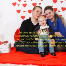 Пишет мама Юлия: «В 2012 году я забеременела Тимуркой. Вся моя беременность протекала хорошо, вот только на последнем месяце мне сказали, что у меня повышенное давление 130/90 (140/70), пришлось лечь на 10 дней подлечиться, самочувствие было отличное (капали капельницы), никаких отеков не было. После выписки я пробыла дома неделю, придя очередной раз на прием – мне сказали готовиться к предродовой госпитализации. При поступлении в роддом 22.03.13г. мне сделали УЗИ, на котором мне сказали примерный вес ребенка 4 кг, обвитие пуповиной.