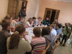После обеда у нас теплая беседа с батюшкой Григорием!Он накануне нового года предлагает подумать и ответить на вопрос: « Что было у вас самое замечательное в старом году и чего вы ждете от нового года?» Ответы были самые разные и радует, что они были детскими! Кого-то печалило огромное количество уроков и заданий в школе… Кого-то проблемы с родителями.. Но в целом радость от старого года и светлые надежды от нового…