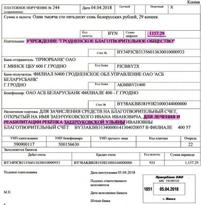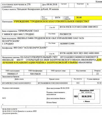 Гродненским благотворительным обществом в 2018 году оказана финансовая помощь в сборе средств на реабилитацию Заенчуковской Ульяны в размере − 1307 рублей 29 копеек (по курсу НБ РБ на 18.06.2018 – 654 доллара США).